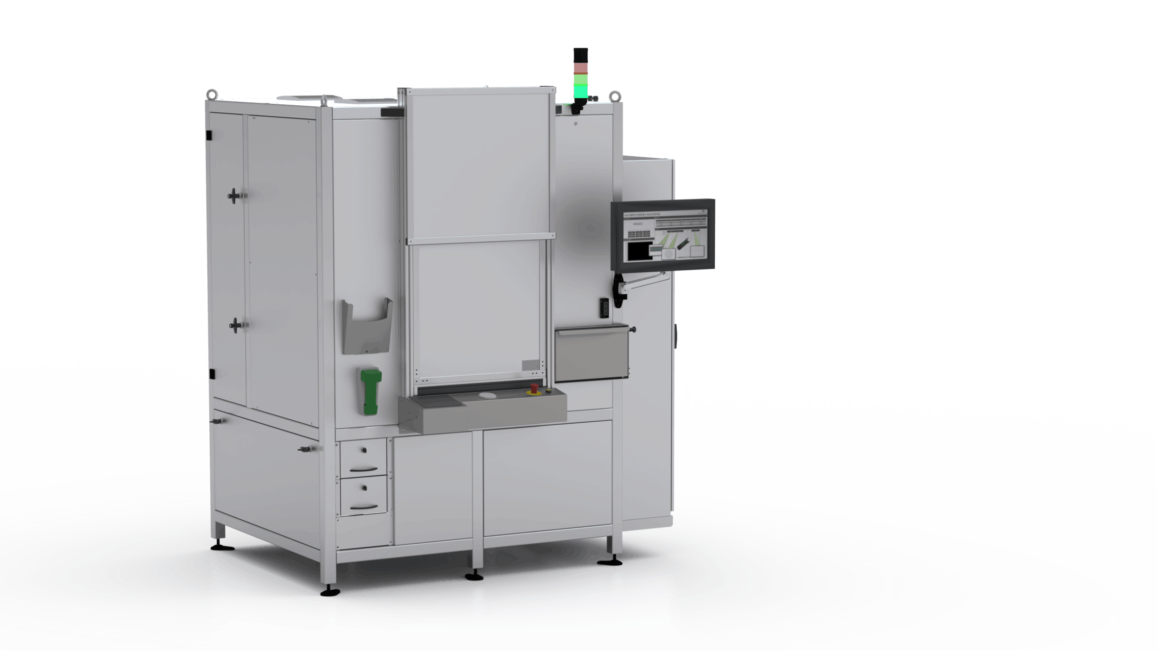 MV.EYE i2 kombiniert unterschiedliche Technologien – Bildgebung, optische Mikrometer und Laser-Triangulation– in einer einzigen Anlage. In der Prüfzelle befindet sich unter anderem ein hochauflösendes Kamerasystem, das trotz des großen Bildfeldes von bis zu 200 x 200 mm mit einer Auflösung von wenigen Mikrometer misst. Höheninformationen werden durch ein optisches Mikrometer sowie durch Lasertriangulation ermittelt.