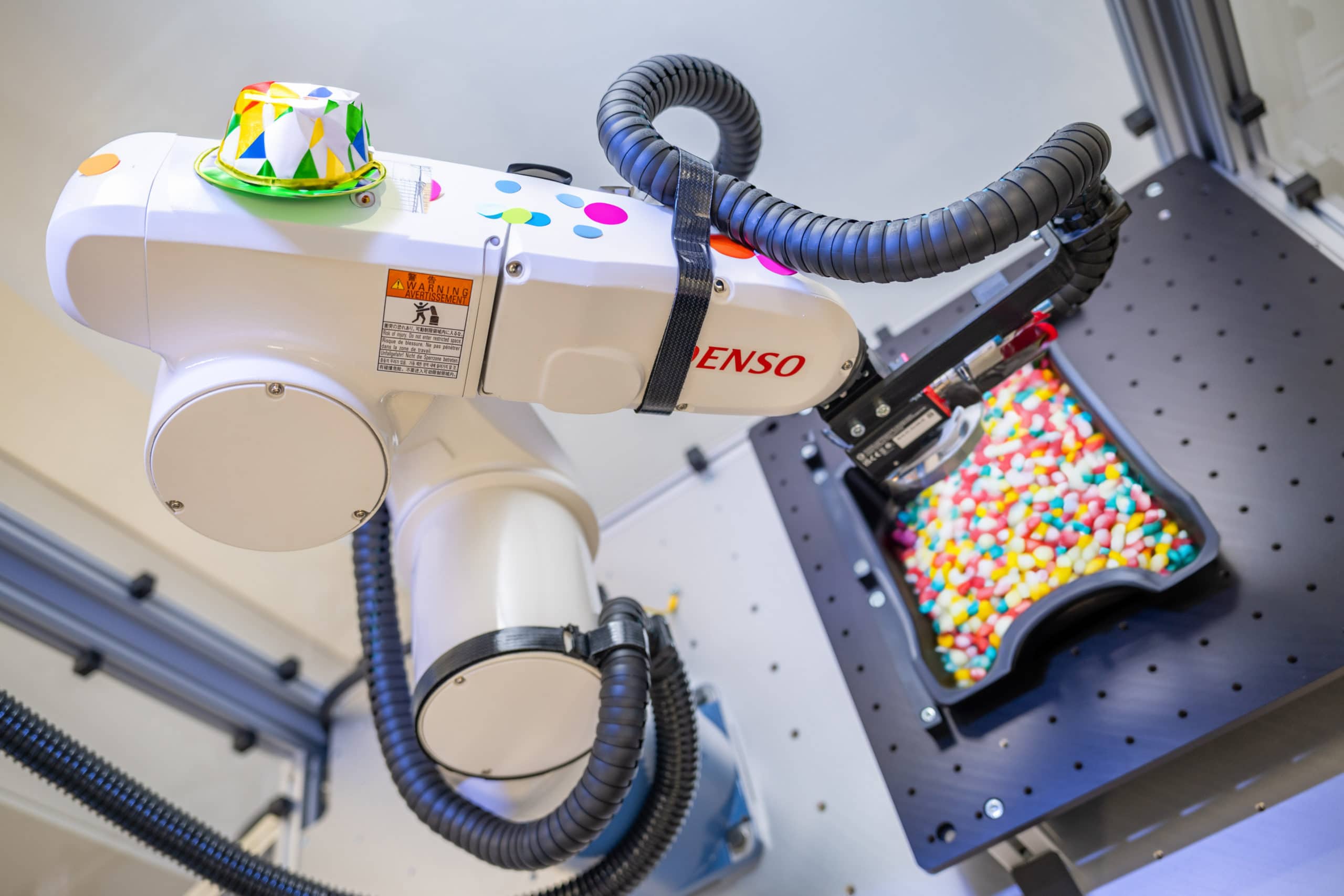Our technology is also taking a humorous break today! Imagine our ROBOT.SPECTOR DMC in a carnival costume: Instead of scanning Data Matrix codes, he's searching for the best costume in the lab!