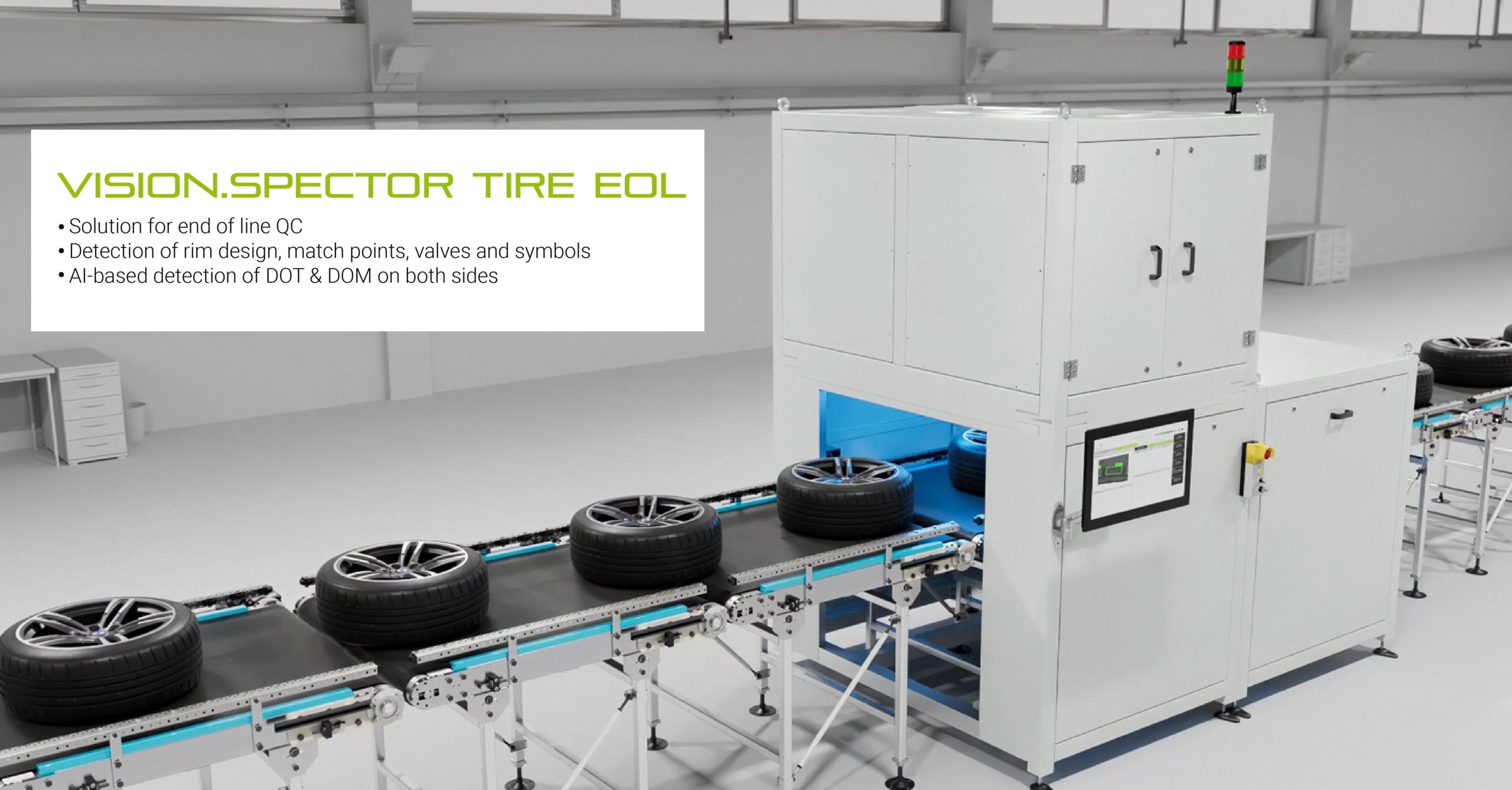 The VISION.SPECTOR TIRE EOL is our comprehensive solution for end-of-line quality control in wheel assembly, tire production and wheel logistics. It enables precise checking of all relevant product characteristics, such as DOT/DOM, rim design, match points, symbols, valves, as well as width and diameter, before the wheels are stored or prepared for assembly on the automobile.