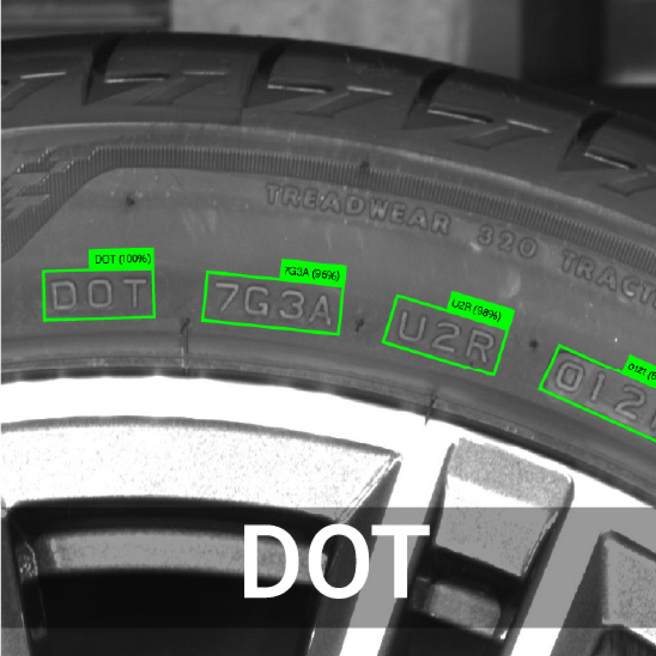 Using artificial intelligence, DOT/DOM codes are precisely identified on the outside and inside of the tire, ensuring full traceability and compliance.